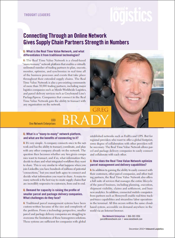 Greg Brady, One Network Founder and CEO, appears in the December issue of Thought Leaders in Inbound Logistics Magazine, answering questions on the Real Time Value Network, the advantages of a “many-to-many network,” and challenges facing parcel companies today, and how they can respond.